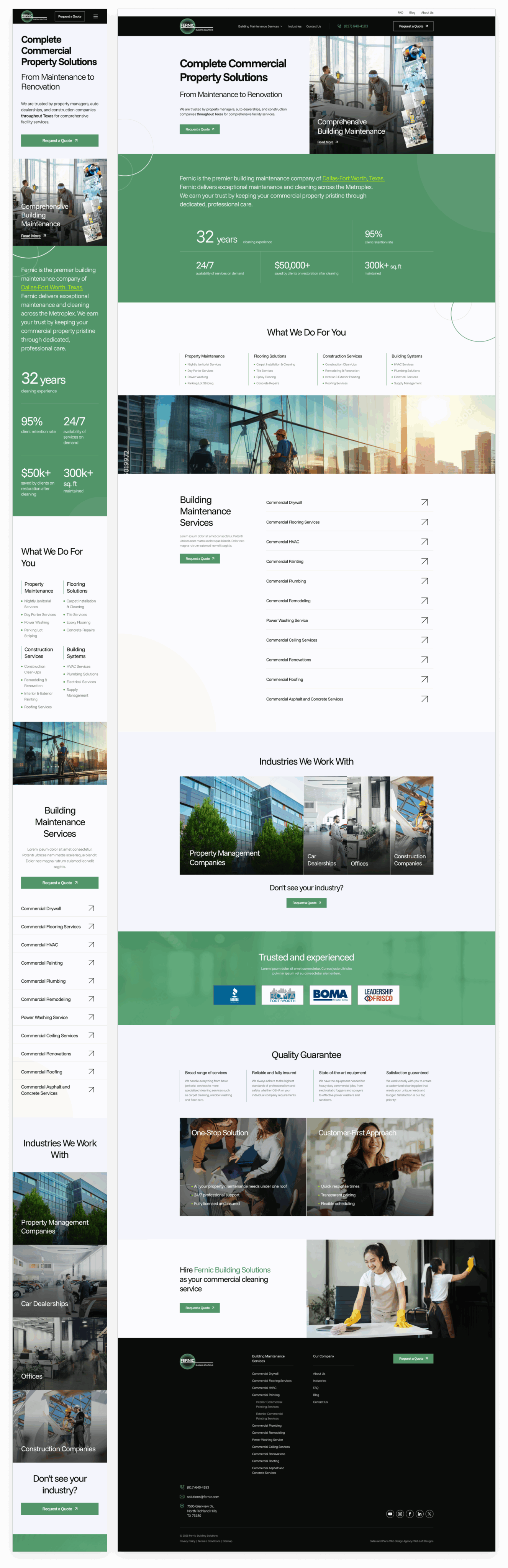 Fernic’s existing WordPress site functioned at a basic level but wasn’t pulling its weight in terms of conversions or brand representation. The generic template didn’t reflect their family-owned, customer-focused personality or the full scope of their building maintenance and janitorial services. Visitors had to dig to understand what Fernic offered, navigation felt flat, and there weren’t enough trust-building elements to turn curious visitors into qualified leads.