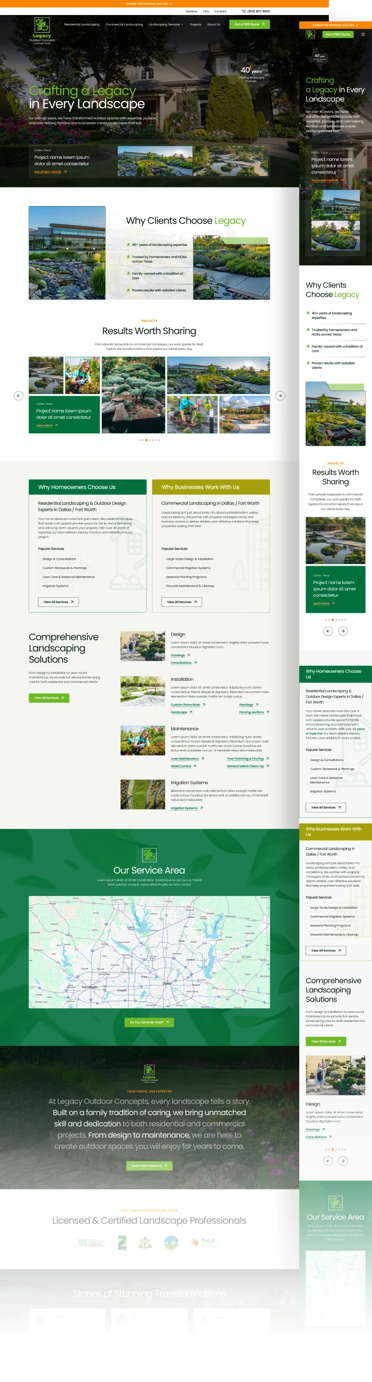 The website was restructured to clearly showcase the breadth of services from landscape design and installation to irrigation, stonework, fencing, and ongoing maintenance while emphasizing experience, professionalism, and attention to detail. Content was refined to speak directly to a more discerning homeowner, reinforcing Legacy’s ability to handle larger properties and complex outdoor projects.