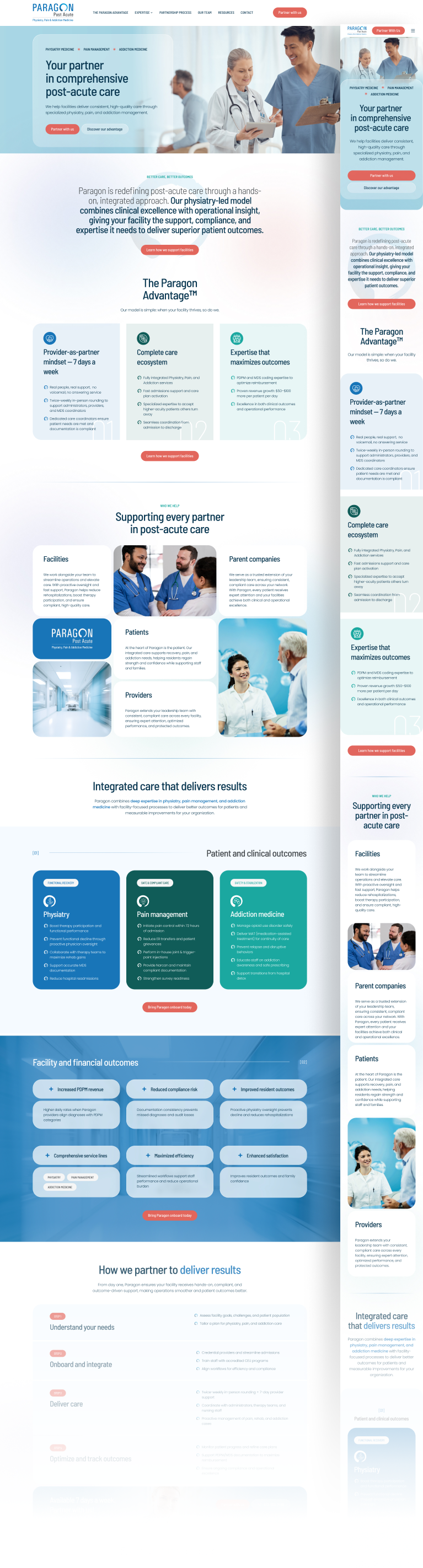 We designed a dedicated Paragon Advantage experience and folded in individual expertise pages for physiatry, pain management, and addiction medicine. Brand updates were applied globally to create a cohesive, modern look, and all key pages were designed in Figma first to ensure alignment before development.