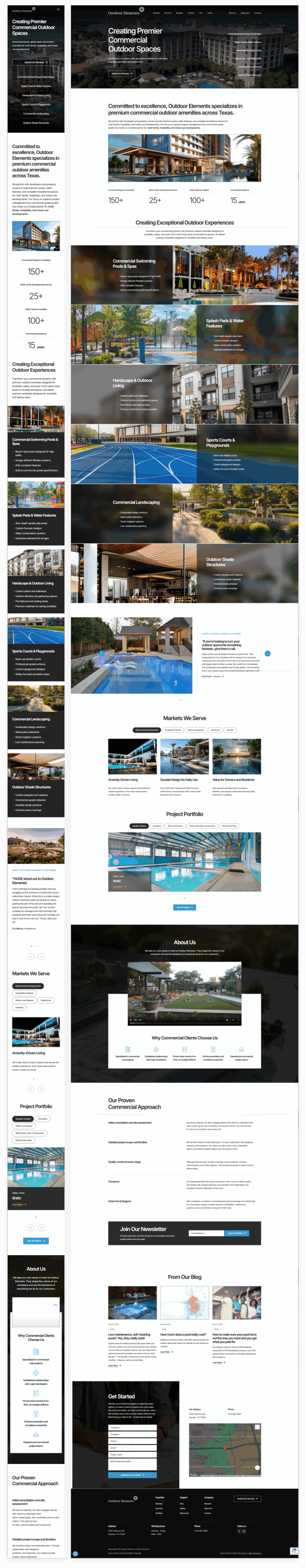 For a fast-growing company like Outdoor Elements LLC, their old website was underselling their expertise. The previous site focused too heavily on residential projects and didn’t reflect the large-scale commercial work such resort-style pools, splash pads, shade structures, playgrounds, and multi-family amenity spaces that actually defines their business. It also lacked SEO visibility and didn’t clearly communicate to developers, general contractors, or property owners. The goal was to reposition Outdoor Elements as a top-tier partner for commercial outdoor environments, showcase their portfolio, and build a strong foundation for growth.